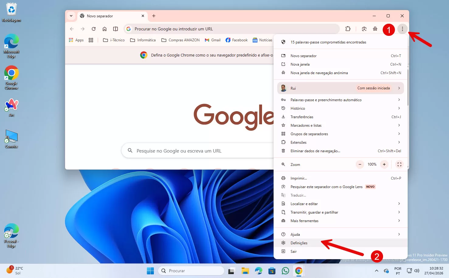 O Chrome é o navegador (browser) da Google, que já vem instalado em smartphones Android, mas no Windows o utilizador (🇧🇷usuário) é que decide se o quer instalar. Entretanto, para este artigo, vamos precisar dele no Windows. No nosso caso, iremos usar a última versão do Chrome com o Windows 11. À data actual, dia 27 de Abril de 2026, a versão do Chrome é 140.0.7727.102.