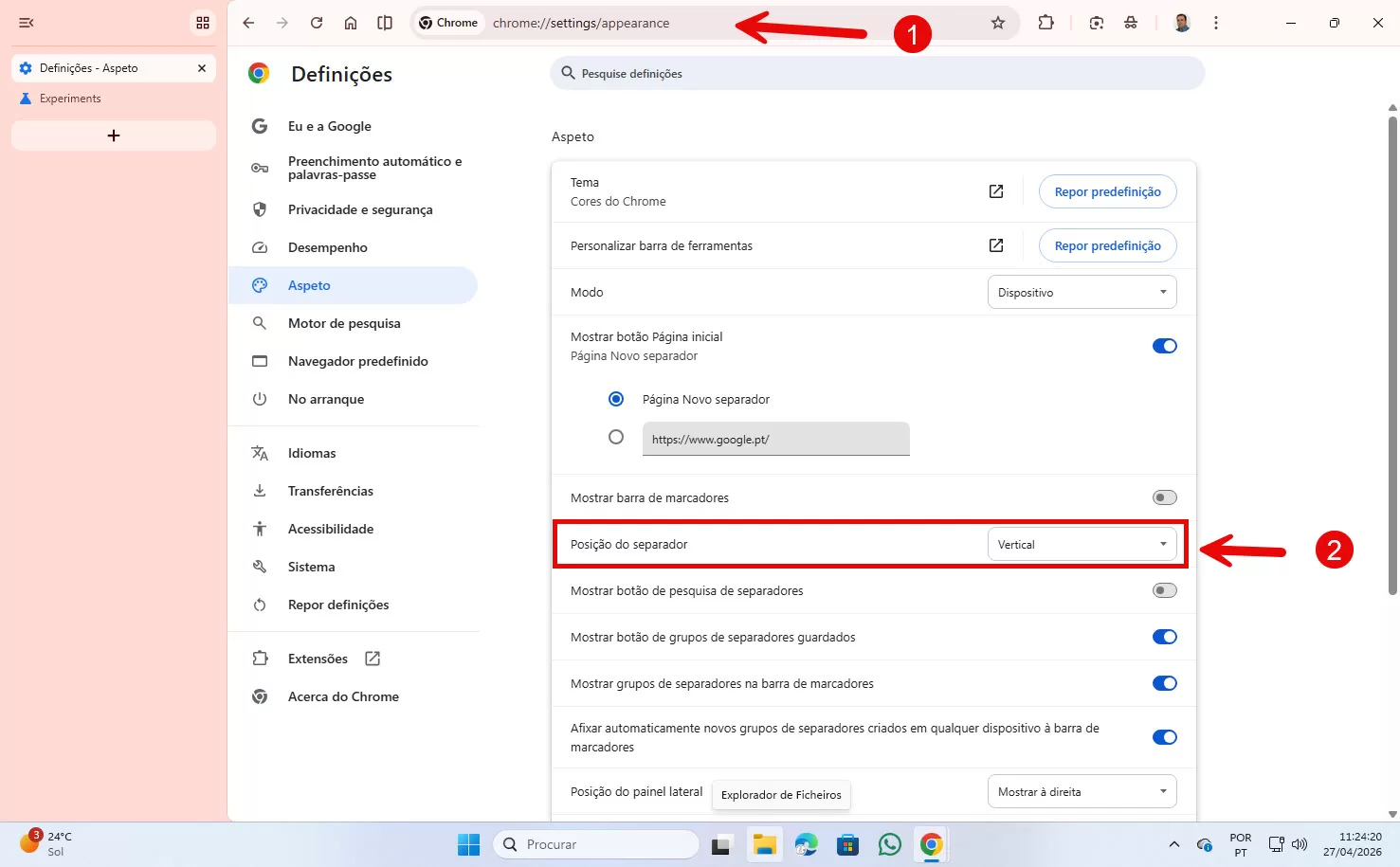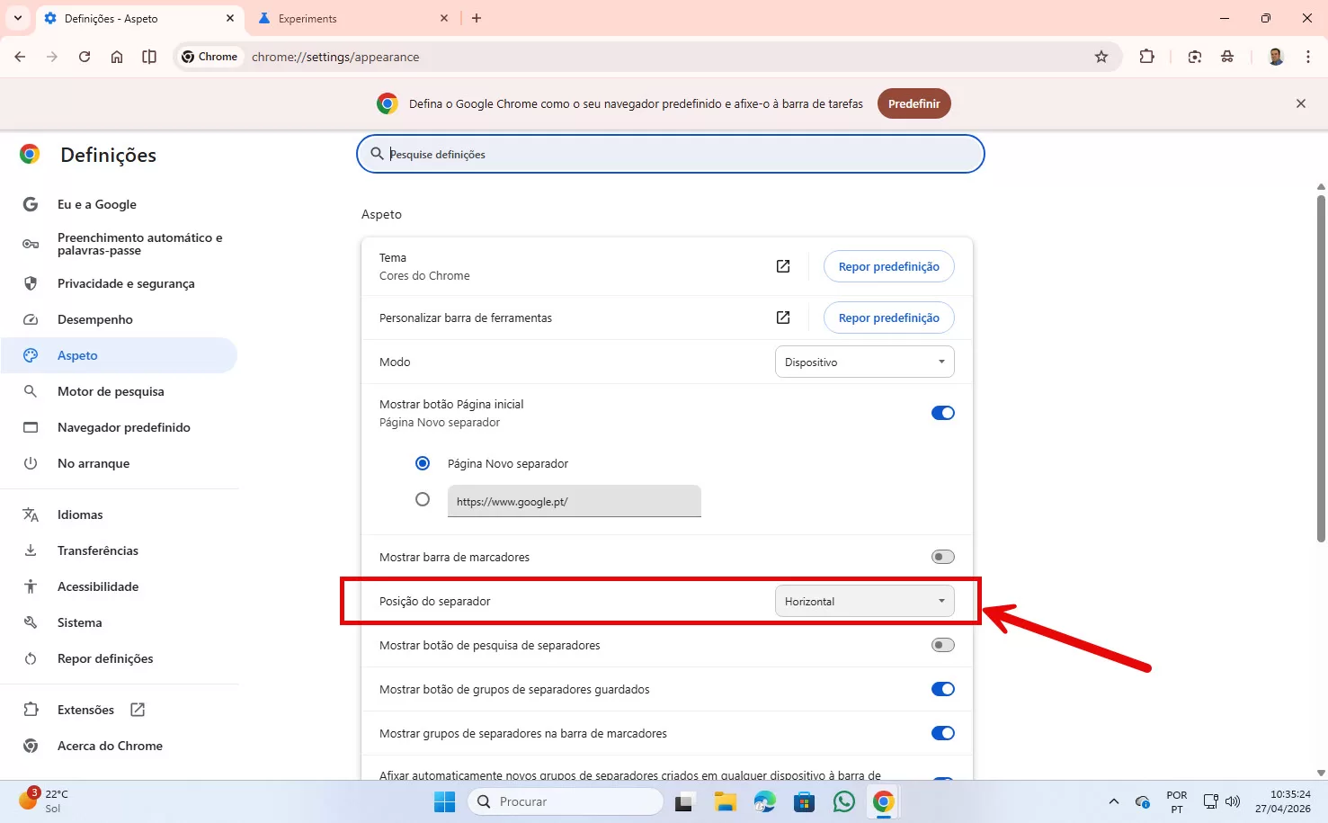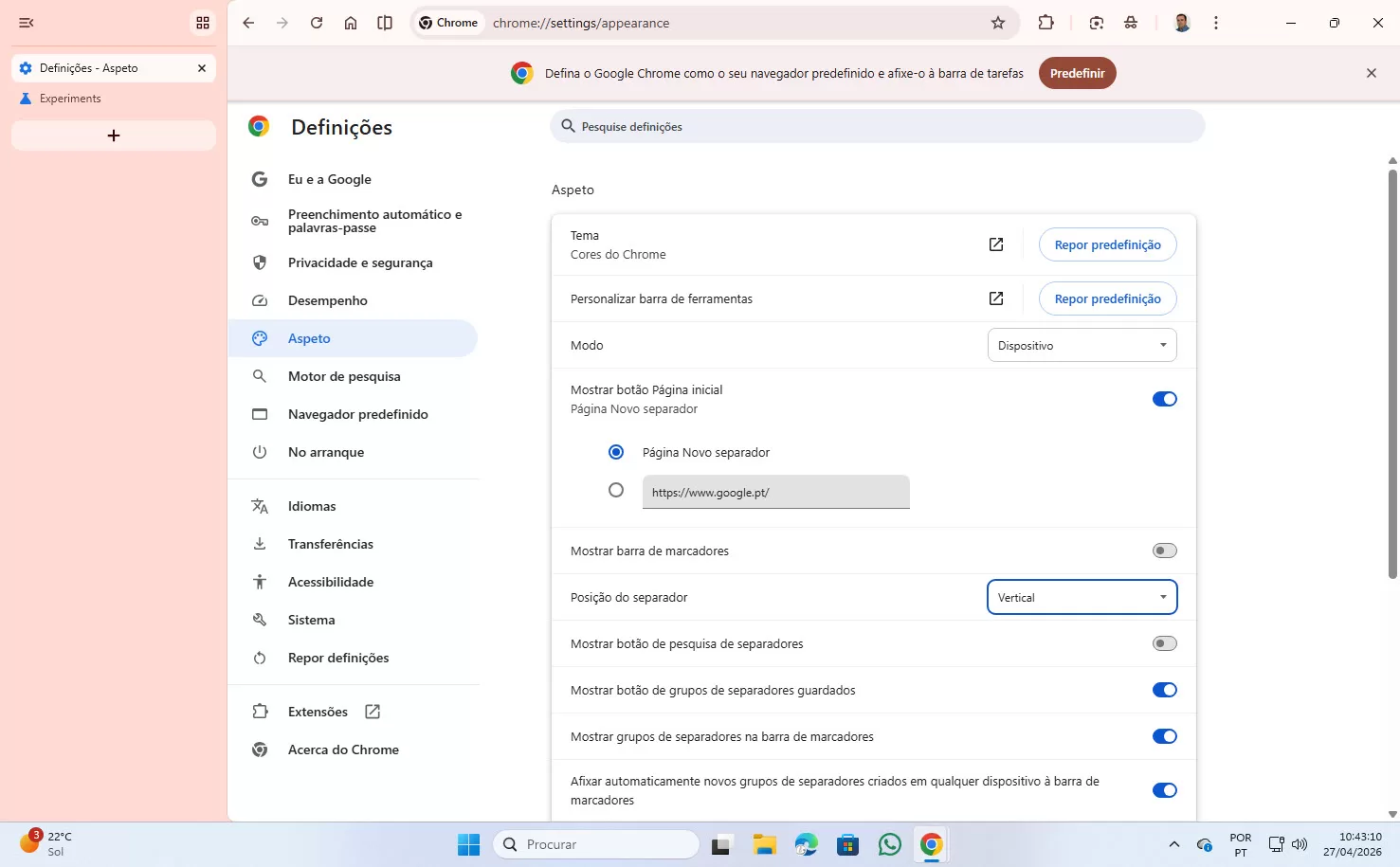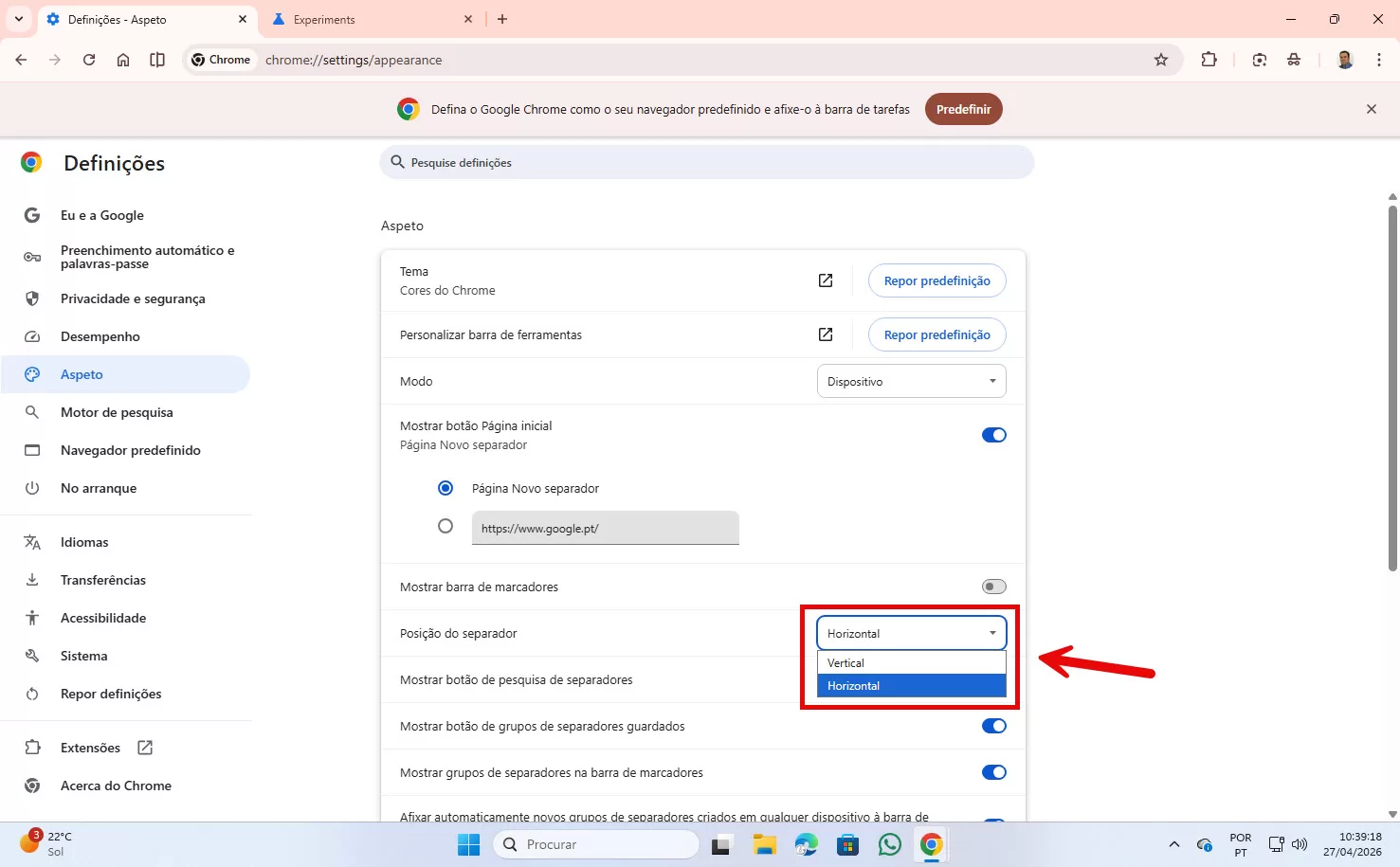 Agora, se voltar ao menu Aspecto das Definições, vai confirmar que já lá está essa opção. Assim como se voltar a fazer o tutorial simples, clicando ao lado do botão ➖ (minimizar) no lado superior direito do Chrome.