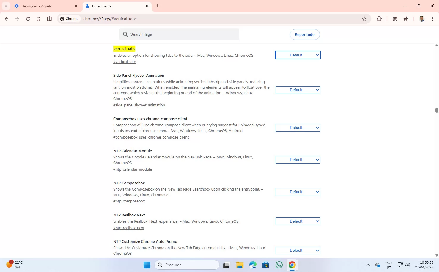 Agora, clique no primeiro “Default” e em “Enable“. Depois, vai aparecer no rodapé a seguinte mensagem: “As alterações terão efeito da próxima vez que voltar a iniciar o Chrome”. No fim da mensagem, está um botão azul “Reiniciar” e é mesmo aí que vai clicar.