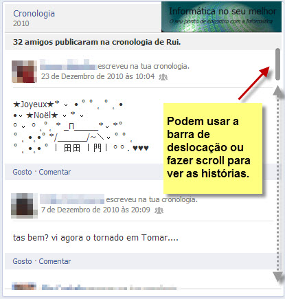 Neste preciso momento, sem clicarmos em lado nenhum, aparece apenas 2 histórias na nossa cronologia do lado direito. Porém existe uma informação de quantas mais estão disponíveis logo em baixo, neste caso “mais 30“. Ao clicarmos lá, já podemos ver todas as histórias que se encontram no nosso mural.