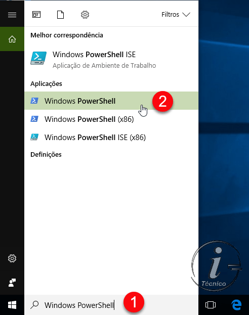 Digite PowerShell onde está escrito “Procurar no Windows” e clique em “Windows PowerShell“. Se quiser usar o teclado, poderá usar a seta baixo ↓ e carregue no enter ↵.